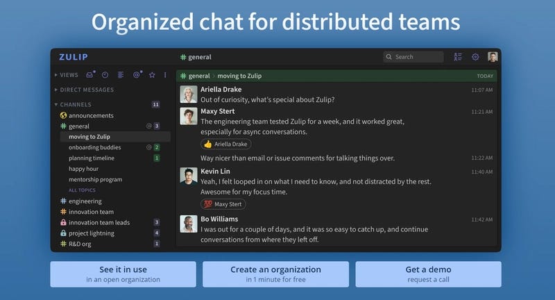 Zulip organizes team chats using topic threads, blending real-time and asynchronous communication to reduce noise.